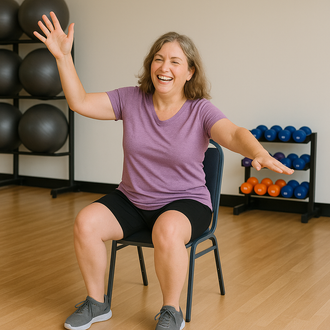 Chair One Fitness is a chair-based dance-fitness program for ALL abilities. We use energizing chair-based dance and fitness movements to improve mobility, flexibility, strength, and posture in a fun, accessible, and uplifting way. All you need is a sturdy chair—no wheels; armless chair preferred.